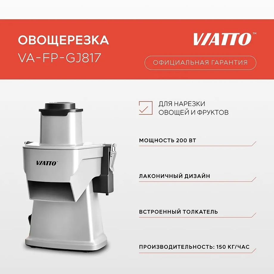 Овощерезка VIATTO VA-FP-GJ817 используется на предприятиях общественного питания, торговли и пищевых производствах для измельчения овощей и фруктов. Модель оснащена защитой от перегрева, глубоким загрузочным бункером и влагозащитным переключателем. Материал корпуса и крышки - алюминиевый сплав.