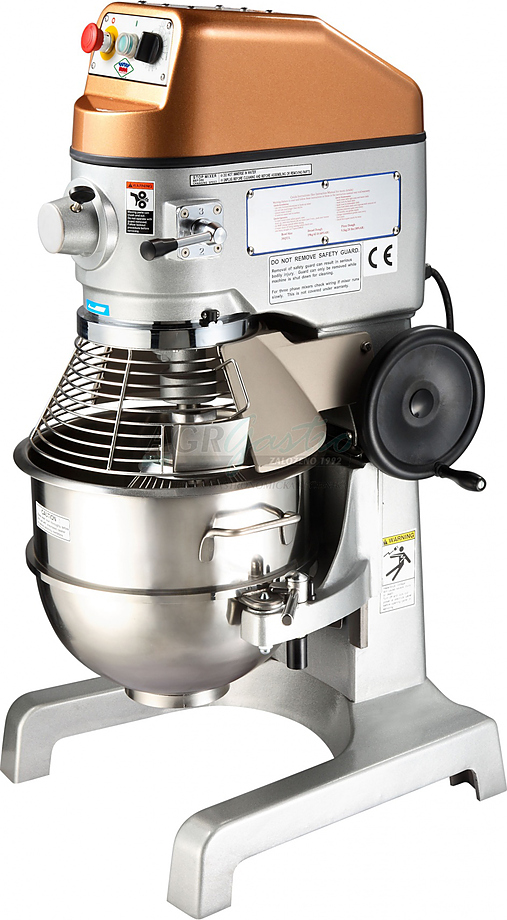Месильный орган вращается вокруг своей оси и оси дежи, тем самым обеспечивая получение однородной массы. Миксер оснащен механической коробкой передач и ручным подъемом дежи.