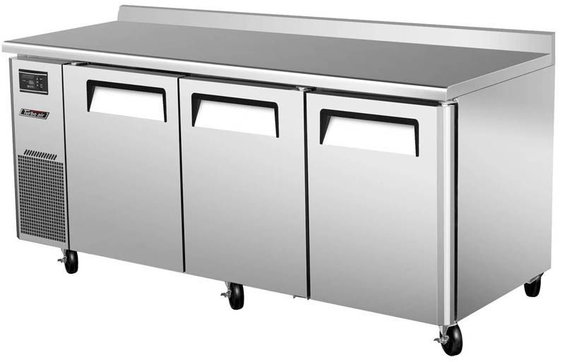Холодильный стол Turbo air KWR18-3 предназначен для раскатки теста, обработки, охлаждения и кратковременного хранения продуктов и напитков на предприятиях общественного питания и торговли. Корпус выполнен из нержавеющей стали (гальванизированная сталь на оборотной стороне и внизу) с применением пожаробезопасных стенок толщиной 60 мм, уплотнения - из АБС-пластика (акрилонитрилбутадиенстирола), не пропускающего конденсата, пол - из нержавеющей стали с алюминиевыми вставками по бокам и сзади оборудования, регулируемые полки - из толстой стальной проволоки с виниловым покрытием.