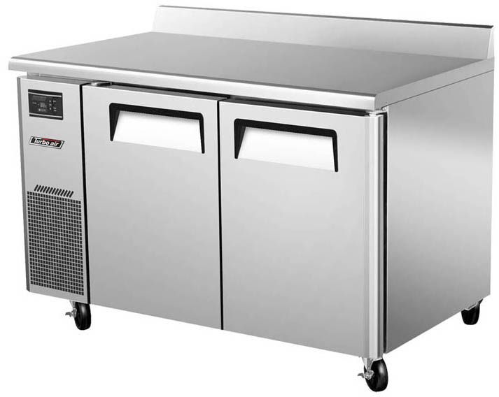 Холодильный стол Turbo air KWR12-2 600 мм предназначен для раскатки теста, обработки, охлаждения и кратковременного хранения продуктов и напитков на предприятиях общественного питания и торговли. Корпус выполнен из нержавеющей стали (гальванизированная сталь на оборотной стороне и внизу) с применением пожаробезопасных стенок толщиной 60 мм, уплотнения - из АБС-пластика (акрилонитрилбутадиенстирола), не пропускающего конденсата, пол - из нержавеющей стали с алюминиевыми вставками по бокам и сзади оборудования, регулируемые полки - из толстой стальной проволоки с виниловым покрытием.