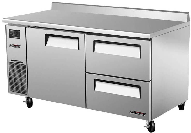 Холодильный стол Turbo air KWR15-2D-2 предназначен для раскатки теста, обработки, охлаждения и кратковременного хранения продуктов и напитков на предприятиях общественного питания и торговли. Корпус выполнен из нержавеющей стали (гальванизированная сталь на оборотной стороне и внизу) с применением пожаробезопасных стенок толщиной 60 мм, уплотнения - из АБС-пластика (акрилонитрилбутадиенстирола), не пропускающего конденсата, пол - из нержавеющей стали с алюминиевыми вставками по бокам и сзади оборудования, тройные направляющие - из высококачественной нержавеющей стали.