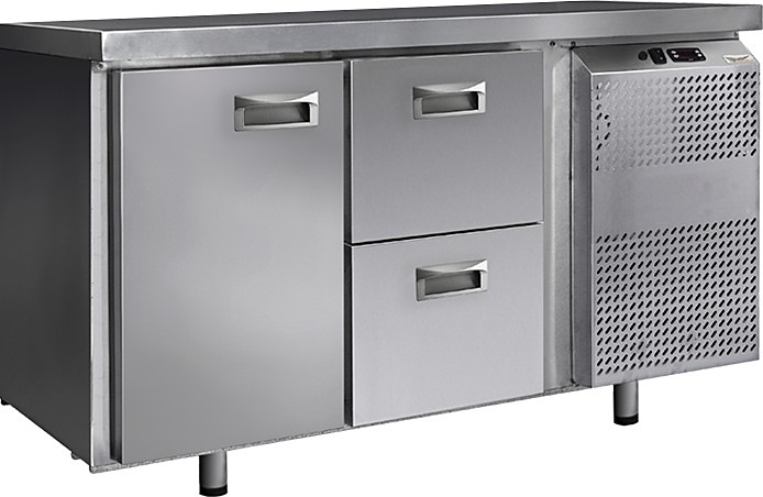 Холодильный стол Finist СХС-700-1/2 используется на предприятиях общественного питания, торговли и пищевых производствах для хранения и обработки полуфабрикатов из мяса и рыбы, заготовок для салата, охлажденных напитков и прочих пищевых продуктов. Управление при помощи кнопочной панели управления, оснащенной цифровым дисплеем. Холодильная камера с распашной дверцей, 2 выдвижных ящика, агрегатный отсек располагается сбоку. Стол установлен на ножки с подпятниками. Материал корпуса - нержавеющая сталь.
