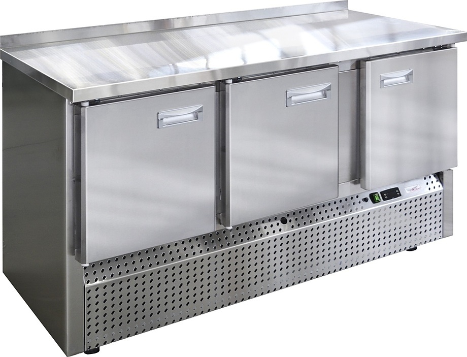 Холодильный стол Finist СХСн-700-3 используется на предприятиях общественного питания, торговли и пищевых производствах для хранения и обработки полуфабрикатов из мяса и рыбы, заготовок для салата, охлажденных напитков и прочих пищевых продуктов. Управление при помощи кнопочной панели управления, оснащенной цифровым дисплеем. 3 камеры с распашными дверцами, агрегатный отсек располагается снизу. Стол установлен на ножки с подпятниками. Материал корпуса - нержавеющая сталь.