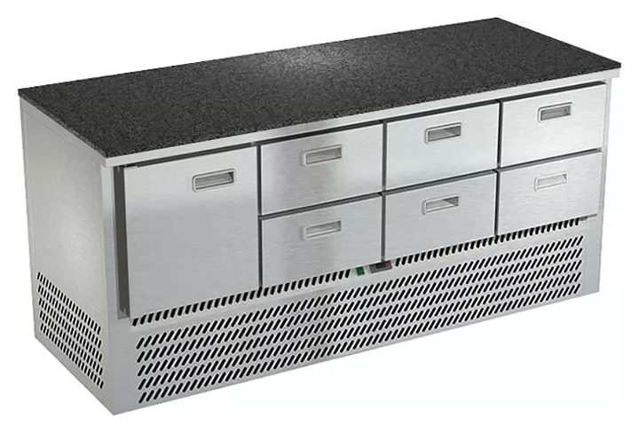 Холодильный стол Техно-ТТ СПН/О-322/16-1906 предназначается для раскатки теста, обработки, охлаждения и кратковременного хранения продуктов и напитков на предприятиях общественного питания, торговли и пищевых производствах. Секции оснащены направляющими и ящиками с доводчиками. Материал корпуса - нержавеющая сталь AISI 430, материал столешницы - гранит (толщина 20 мм), материал задней панели и дна - оцинкованная сталь.