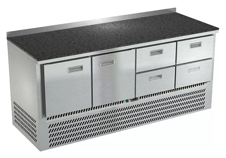 Холодильный стол Техно-ТТ СПН/О-422/24-1906 предназначается для раскатки теста, обработки, охлаждения и кратковременного хранения продуктов и напитков на предприятиях общественного питания, торговли и пищевых производствах. Секции оснащены направляющими и ящиками с доводчиками. Материал корпуса - нержавеющая сталь AISI 430, материал столешницы - гранит (толщина 20 мм), материал задней панели и дна - оцинкованная сталь.