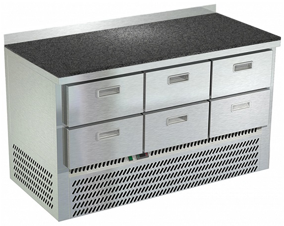 Холодильный стол Техно-ТТ СПН/О-423/06-1406 предназначается для раскатки теста, обработки, охлаждения и кратковременного хранения продуктов и напитков на предприятиях общественного питания, торговли и пищевых производствах. Секции оснащены направляющими и ящиками с доводчиками. Материал корпуса - нержавеющая сталь AISI 430, материал столешницы - гранит (толщина 20 мм), материал задней панели и дна - оцинкованная сталь.