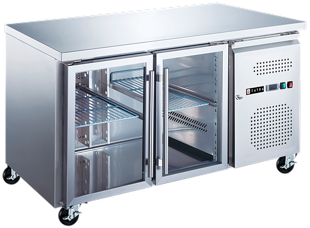 Холодильный стол Tatra TRTGN2 TN G используется на предприятиях общественного питания, торговли и пищевых производствах для охлаждения и кратковременного хранения различных блюд, напитков и продуктов, а также для раскатки теста и обработки ингредиентов. Модель оснащена 3 секциями с самозакрывающимися стеклянными дверьми с магнитным уплотнителем и цифровым термостатом. Материал корпуса и столешницы - нержавеющая сталь, теплоизоляция выполнена из полиуретана.