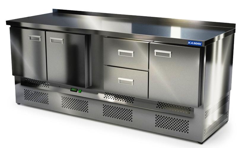 Холодильный стол КАМИК СО-32207Н используется на предприятиях общественного питания и торговли для охлаждения и хранения продуктов, напитков и готовых блюд. Конструкция разделена на секции, каждая из которых оборудована сетчатой полкой и парой направляющих. Корпус выполнен из нержавеющей стали AISI 430 толщиной 1 мм, столешница - из нержавеющей стали AISI 304 толщиной 1,5 мм.