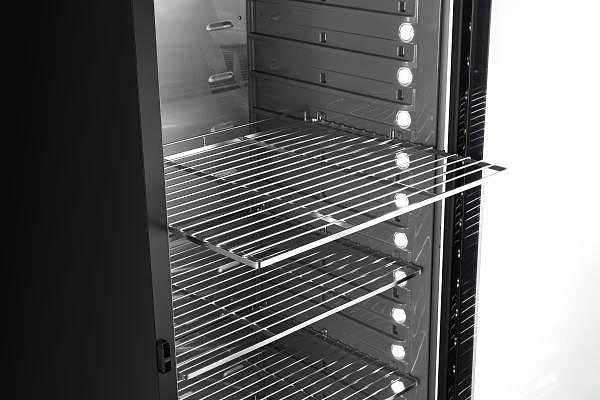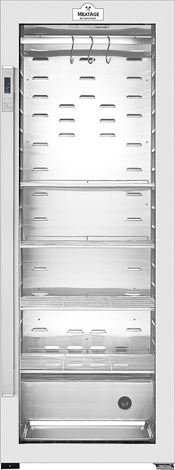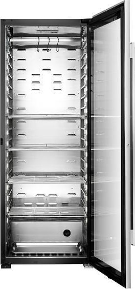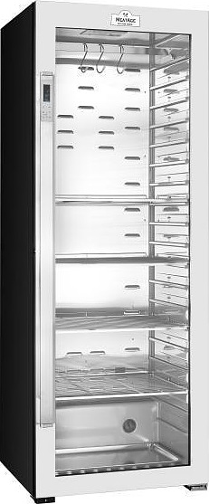 Шкаф для мяса MeatAge VI200 используется для охлаждения, хранения и вызревания мяса, ветчины и салями на предприятиях общественного питания, торговли, пищевых производствах и в домашних условиях. Модель оснащена регулировкой температуры и влажности, автоматической разморозкой, системой испарения конденсата, тачпадом со светодиодной подсветкой, оптической и акустической сигнализацией, регулируемыми полками, механическим замком и резервуаром для воды. Материал корпуса - окрашенный металл, материал боковых внутренних стенок - ABS-пластик, материал полок, задней стенки и комплектующих - высококачественная нержавеющая сталь, материал двери - ударопрочное закаленное стекло.