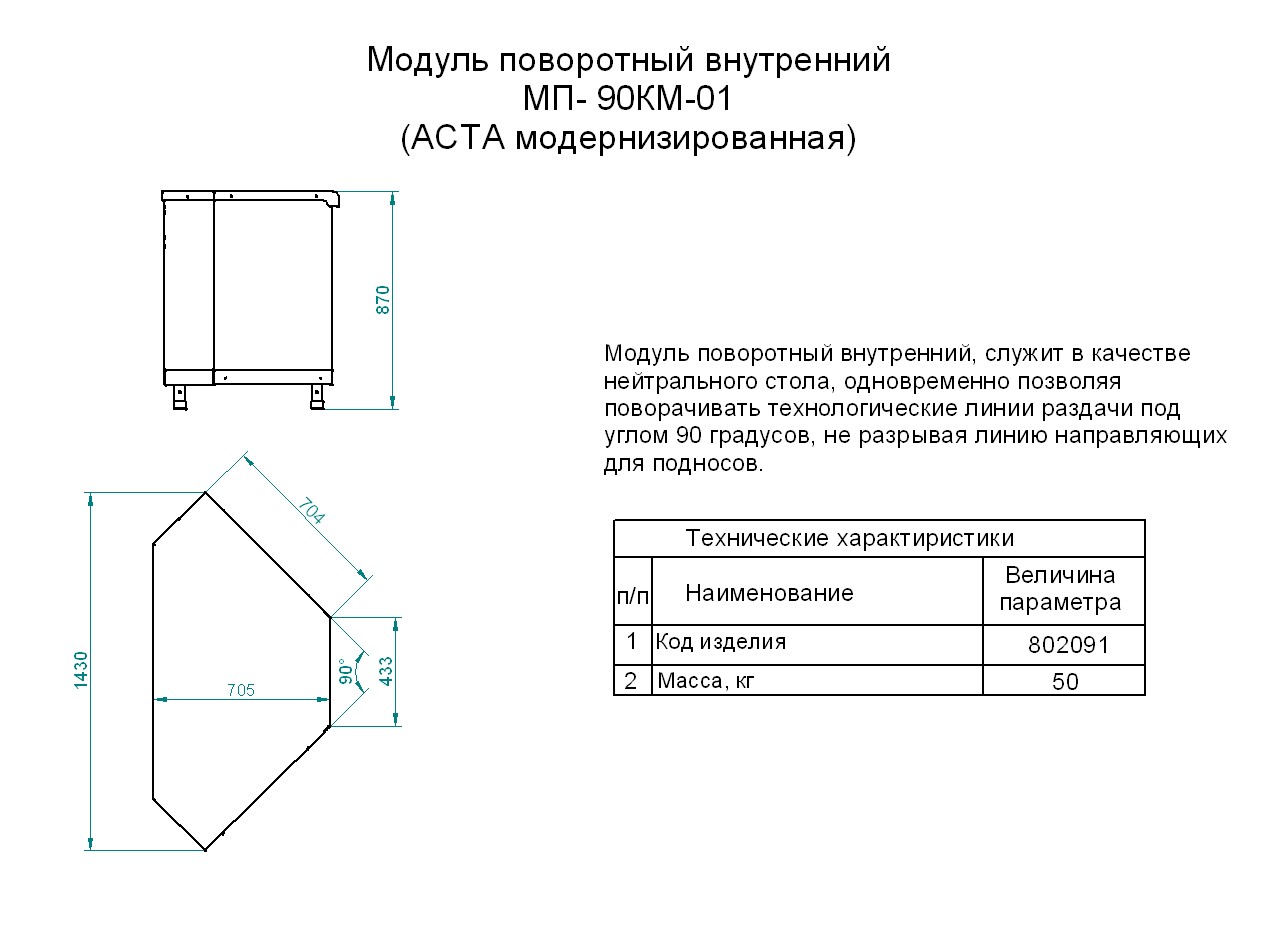 Поворотный модуль Abat МП-90КМ-01 предназначен для выкладки хлебобулочных, кондитерских изделий, посуды и столовых приборов на предприятиях общественного питания и торговли.