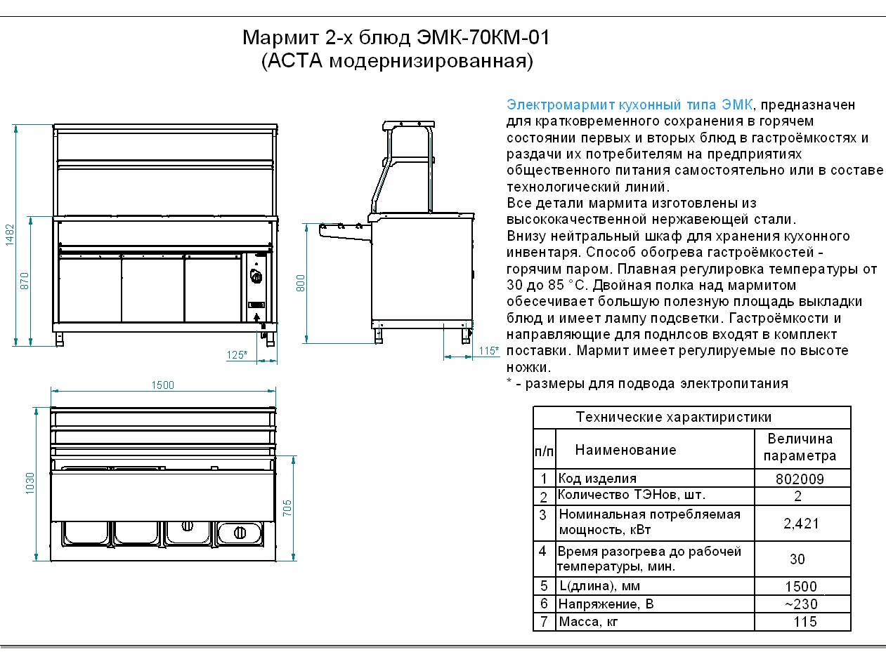 Мармит Abat ЭМК-70КМ-01 предназначен для демонстрации, кратковременного хранения и поддержания вторых блюд в горячем состоянии в составе линий раздач на предприятиях общественного питания и торговли. Модель оснащена регулируемыми по высоте ножками.