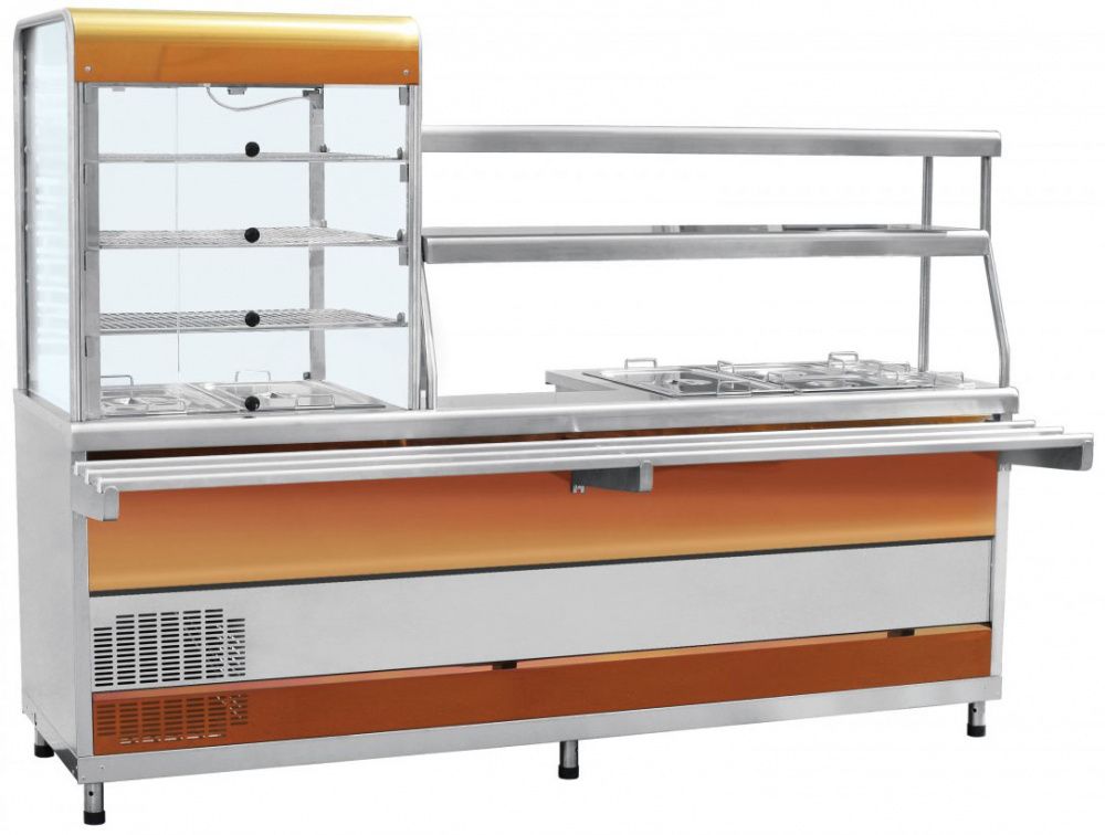 Прилавок-витрина Abat ПВХМ-70КМУ предназначен для демонстрации, охлаждения, кратковременного хранения и поддержания первых и вторых блюд в горячем состоянии в составе линий раздач на предприятиях общественного питания и торговли. Этому способствует наличие холодильной витрины и мармитного отдела для первых и вторых блюд. Модель оснащена регулируемыми по высоте ножками.