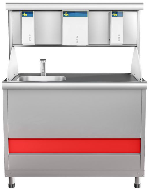 Модуль Abat ПВДР-70КМ используется на предприятиях общественного питания, торговли и пищевых производствах для санитарной обработки рук посетителей. Модель оснащена полкой, электросушкой для рук, автоматической подачей жидкого мыла и антисептика, раковиной, смесителем, электрическим выключателем и регулируемыми ножками. Материал столешницы - высококачественная нержавеющая сталь AISI 430.