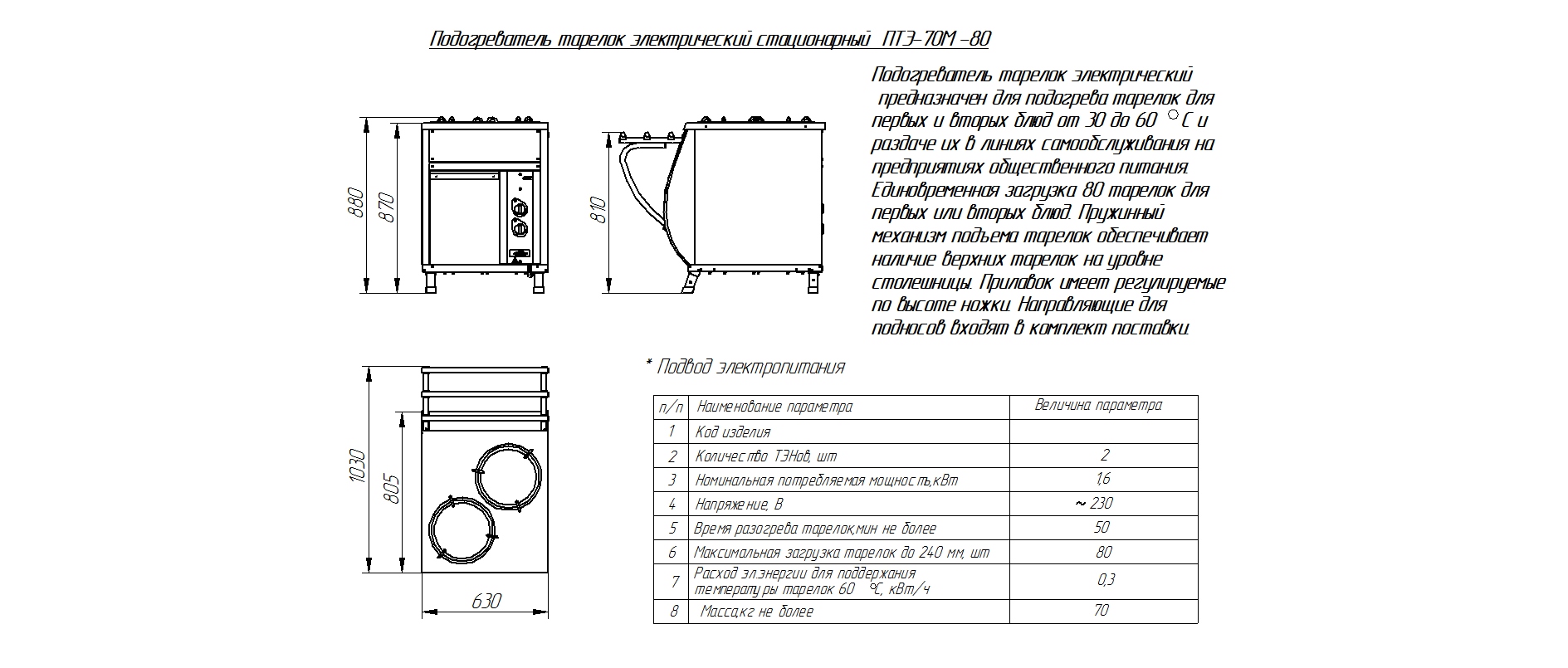 Прилавок для подогрева тарелок Abat ПТЭ-70М-80 предназначен для подготовки посуды к последующему использованию и поддержания в теплом состоянии в составе линий раздач на предприятиях общественного питания и торговли. Модель оснащена пружинным механизмом кассетницы, которая производит автоматический подъем тарелок по мере их использования и регулируемыми по высоте ножками..