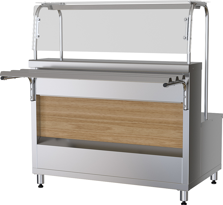 Прилавок-мармит Марихолодмаш ПМПЭ15 используется в составе линии раздачи Шеф 1500 на предприятиях общественного питания, торговли и пищевых производствах для подогрева, демонстрационной выкладки и кратковременного хранения первых блюд, хлебобулочных и кондитерских изделий, напитков и посуды. Прилавок оснащен конфоркой, полкой, диодной подсветкой и защитным экраном. Материал корпуса - высококачественная нержавеющая сталь.
