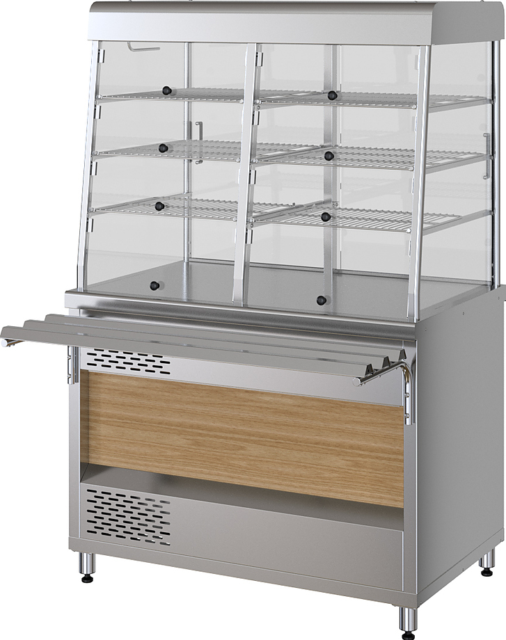 Прилавок-витрина Марихолодмаш ПМПЭ11 используется в составе линии раздачи Шеф 1120 на предприятиях общественного питания, торговли и пищевых производствах для демонстрационной выкладки и кратковременного хранения готовых блюд, хлебобулочных и кондитерских изделий, напитков и посуды. Прилавок оснащен охлаждаемой столешницей, полками-решетками и диодным освещением. Материал корпуса - высококачественная нержавеющая сталь.