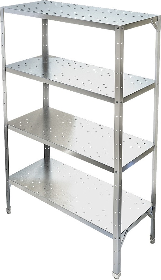 Кухонный стеллаж Техно-ТТ СТР- 434/504 используется на предприятиях общественного питания, торговли и пищевых производствах для хранения посуды, кухонного инвентаря и продуктов. В модели предусмотрены регулируемые ножки и полки. Тип каркаса - разборный, полки - перфорированные. Материал каркаса - нержавеющая сталь AISI 304 (труба 40х20 мм толщиной 1.2 мм), материал полок - нержавеющая сталь AISI 304 (толщина 0.8 мм).
