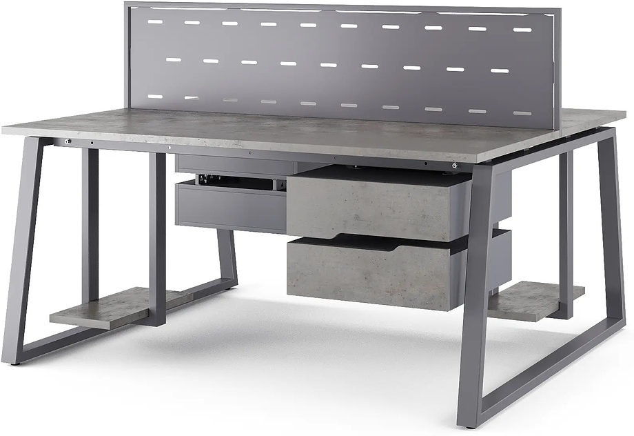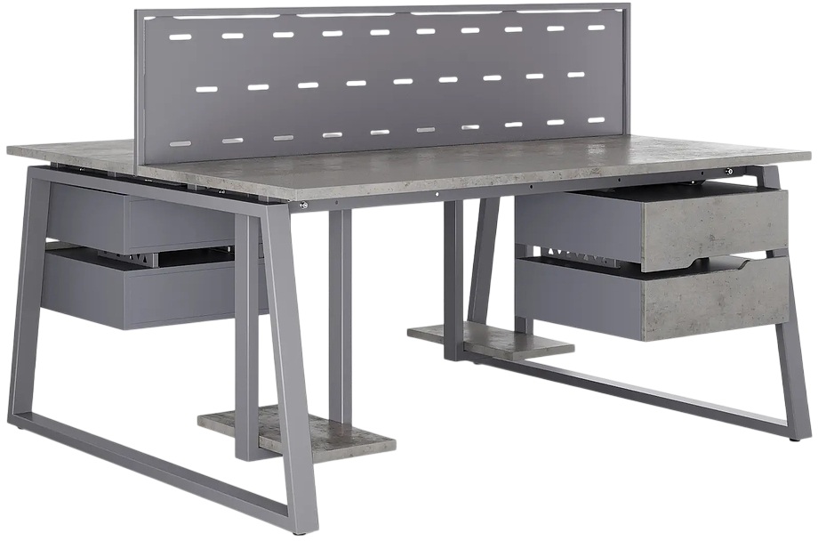 Офисный стол Кобор TR/2-80/120 graphite/chicago предназначен для двух рабочих мест и идеально подходит для офисов и кабинетов руководителей. Модель оснащена опорами в форме трапеции. Материал столешницы - прочный ЛДСП толщиной 25 мм, усиленная снизу металлическим каркасом, материал опор и каркаса - окрашенный металл.