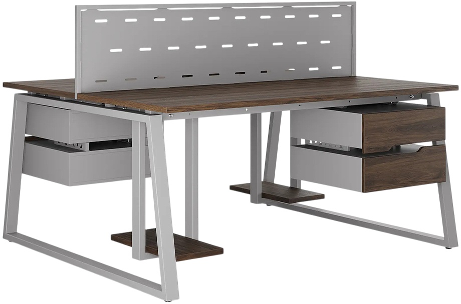 Офисный стол Кобор TR/2-80/120 aluminum/charlston предназначен для двух рабочих мест и идеально подходит для офисов и кабинетов руководителей. Модель оснащена опорами в форме трапеции. Материал столешницы - прочный ЛДСП толщиной 25 мм, усиленная снизу металлическим каркасом, материал опор и каркаса - окрашенный металл.