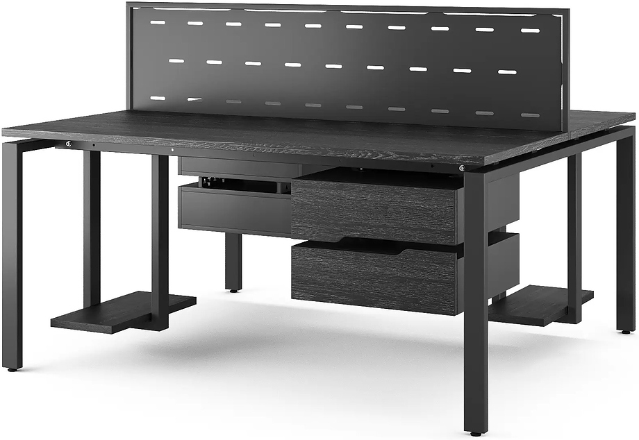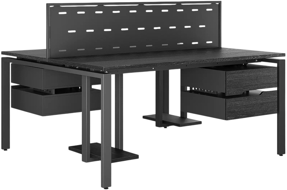 Офисный стол Кобор P/2-80/120 black/wood предназначен для двух рабочих мест и идеально подходит для офисов и кабинетов руководителей. Модель оснащена П-образными опорами. Материал столешницы - прочный ЛДСП толщиной 25 мм, усиленная снизу металлическим каркасом, материал опор и каркаса - окрашенный металл.
