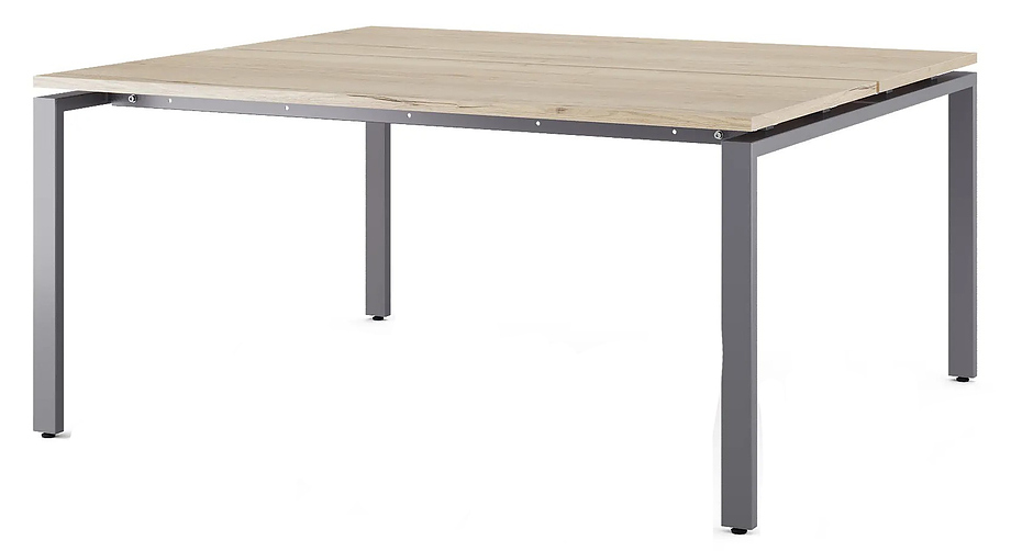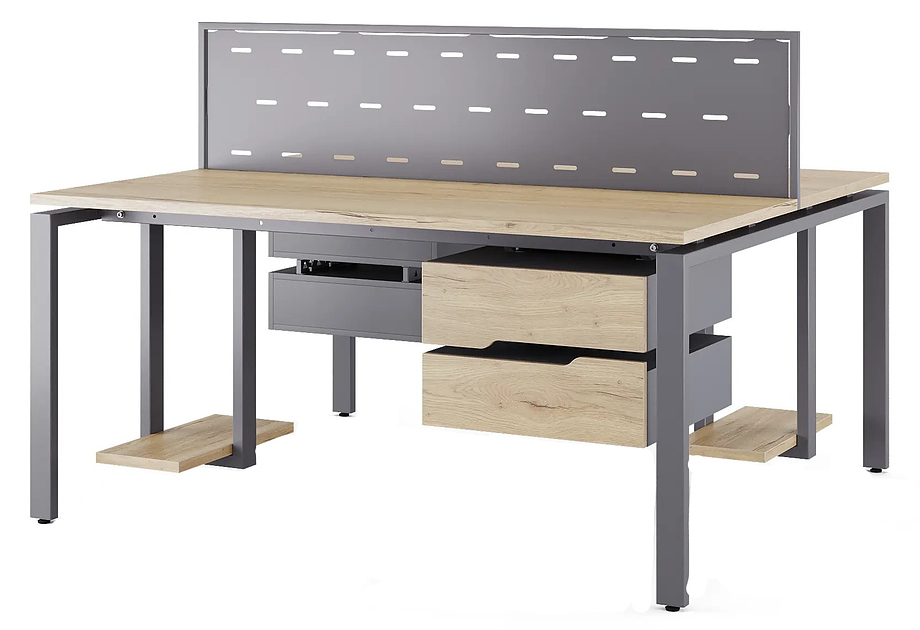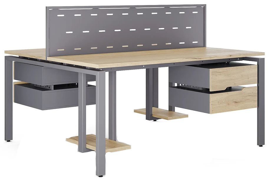 Офисный стол Кобор P/2-140/140 graphite/natural предназначен для двух рабочих мест и идеально подходит для офисов и кабинетов руководителей. Модель оснащена П-образными опорами. Материал столешницы - прочный ЛДСП толщиной 25 мм, усиленная снизу металлическим каркасом, материал опор и каркаса - окрашенный металл.