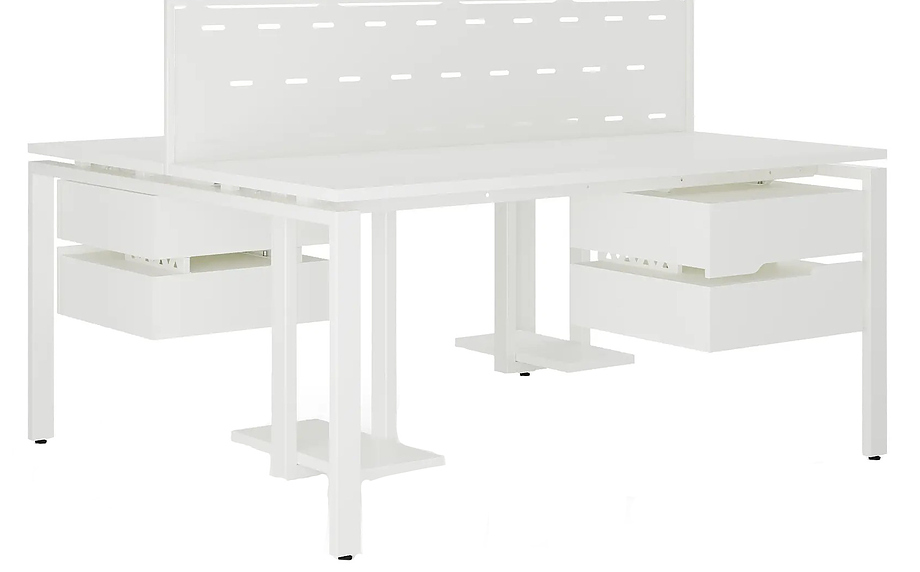 Офисный стол Кобор P/2-140/140 white/premium предназначен для двух рабочих мест и идеально подходит для офисов и кабинетов руководителей. Модель оснащена П-образными опорами. Материал столешницы - прочный ЛДСП толщиной 25 мм, усиленная снизу металлическим каркасом, материал опор и каркаса - окрашенный металл.