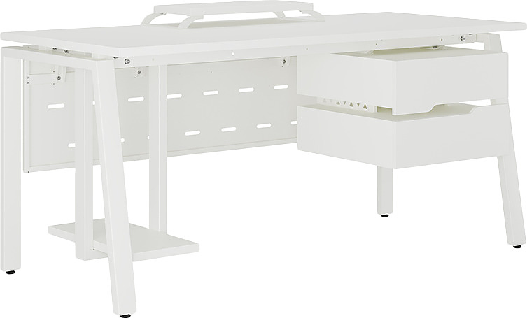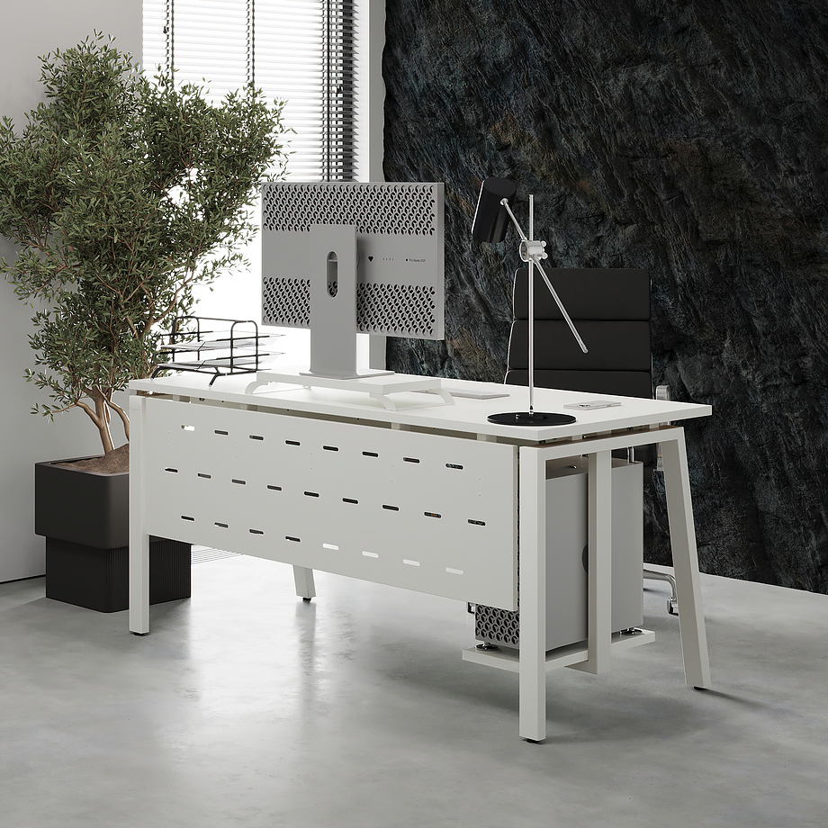 Офисный стол КОБОР AB-120/60 white/premium используется в офисных помещениях и кабинетах руководителей. Модель оснащена A-образными опорами со скошенными фронтальными сегментами. Материал столешницы - прочный ЛДСП толщиной 25 мм, усиленная снизу металлическим каркасом, материал опор и каркаса - окрашенный металл.