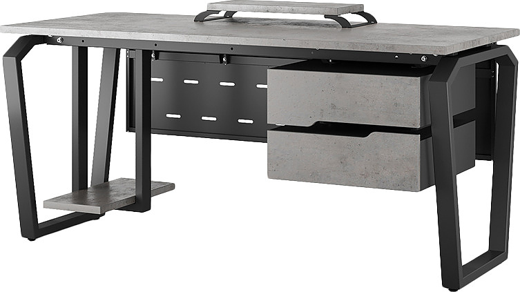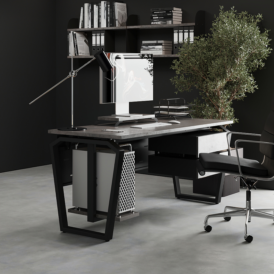 Офисный стол КОБОР TB-120/60 black/chicago используется в офисных помещениях и кабинетах руководителей. Конструкция модели включает опоры, выполненные в виде перевернутой трапеции со скошенными верхними углами. Материал столешницы - прочный ЛДСП толщиной 25 мм, усиленная снизу металлическим каркасом, материал опор - окрашенный металл.