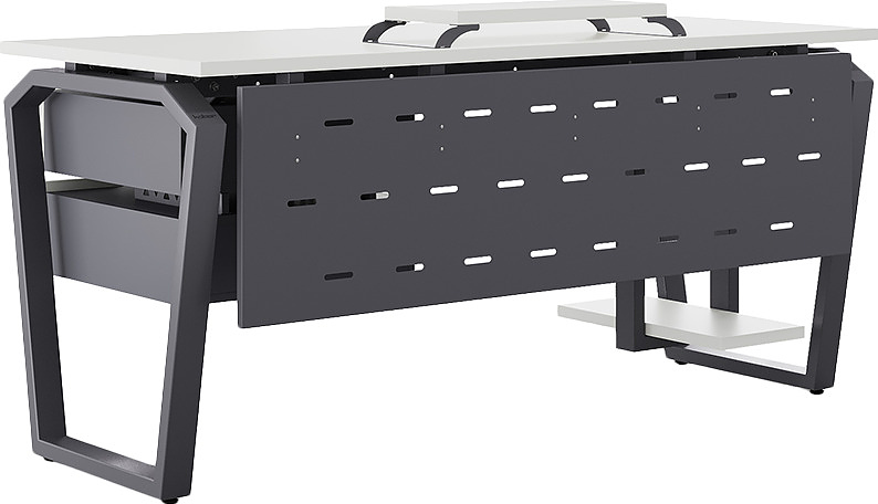 Офисный стол КОБОР TB-120/60 graphite/premium используется в офисных помещениях и кабинетах руководителей. Конструкция модели включает опоры, выполненные в виде перевернутой трапеции со скошенными верхними углами. Материал столешницы - прочный ЛДСП толщиной 25 мм, усиленная снизу металлическим каркасом, материал опор - окрашенный металл.