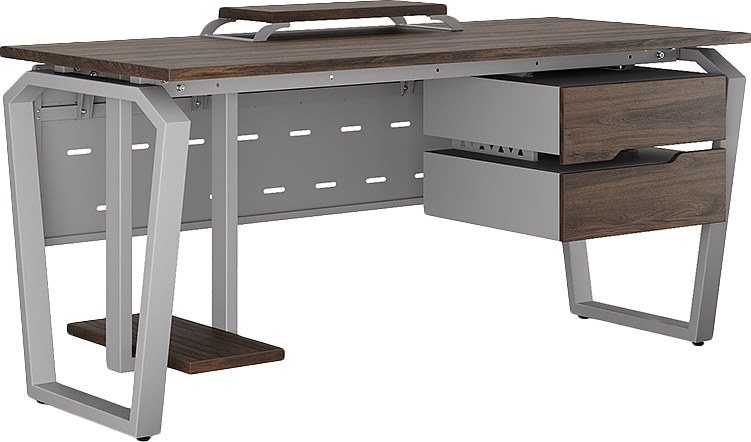 Офисный стол КОБОР TB-140/70 aluminum/charlston используется в офисных помещениях и кабинетах руководителей. Конструкция модели включает опоры, выполненные в виде перевернутой трапеции со скошенными верхними углами. Материал столешницы - прочный ЛДСП толщиной 25 мм, усиленная снизу металлическим каркасом, материал опор - окрашенный металл.