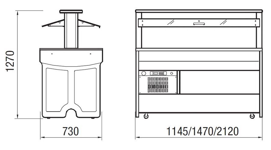 Салат-бар легко подключить в любом месте, где имеется электрическая розетка с напряжением 220 вольт. Удобство в транспортировке даёт наличие роликовых колёсиков.
