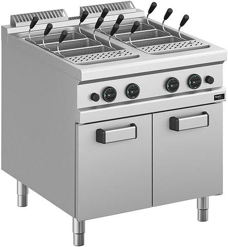 Макароноварка Apach APPG-89P/PL 900-й серии используется на предприятиях общественного питания и торговли для отваривания спагетти, пасты и прочих изделий из теста. Модель оснащена закрытым шкафом с 2 распашными дверцами, электромеханической панелью управления с 2 терморегуляторами и таймерами и горелками с пьезоэлектрическим поджигом и системой стабилизации пламени. Корпус, рабочая поверхность, панель управления и вытяжная решетка выполнены из нержавеющей стали AISI 304, дверцы, боковые и задние панели - из нержавеющей стали AISI 430, ванна - из нержавеющей стали AISI 316.