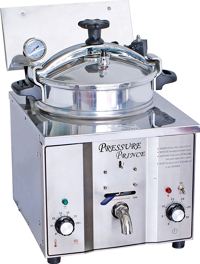 Фритюрница Kocateg PFE16 под давлением предназначена для приготовления различных продуктов в большом количестве масла или жира на предприятиях общественного питания и торговли. Модель оснащена механической панелью управления, термостатом для регулировки температуры, таймером до 90 минут и защитным термостатом, автоматически отключающим напряжение при повреждении основного термостата. Емкость выполнена из алюминия, корпус - из нержавеющей стали AISI 304, крышка - из каленого стекла, ножки - из пластика.