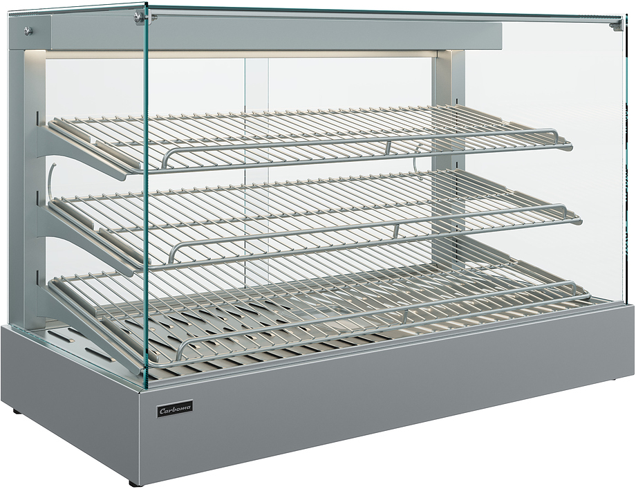 Настольная тепловая витрина Carboma AC45 HWB 0,9-1 используется на предприятиях общественного питания, торговли и пищевых производствах для продажи, демонстрации, кратковременного хранения и поддержки в горячем состоянии готовых блюд, пицц, выпечки и других изделий. Оборудование оснащено системой пароувлажнения (типа мармит), задними створками-слайдерами, полками-решетками, термометром, термостатом, гастроемкостью для воды, верхней LED-подсветкой, выдвижным поддоном для сбора крошек и регулируемыми ножками. Материал корпуса и полок - высококачественная нержавеющая сталь.