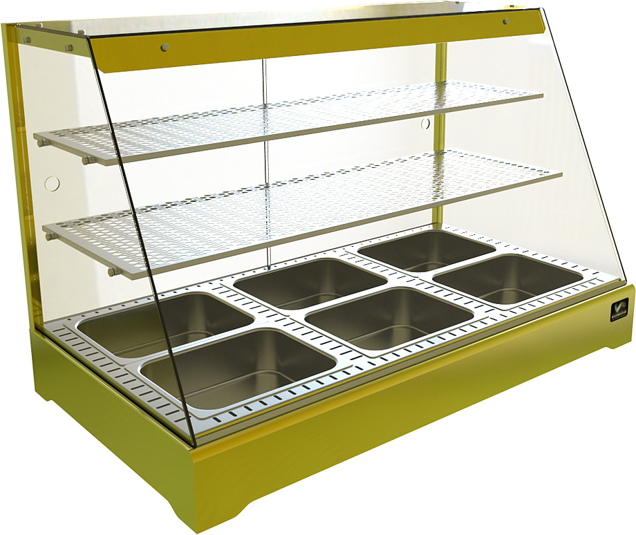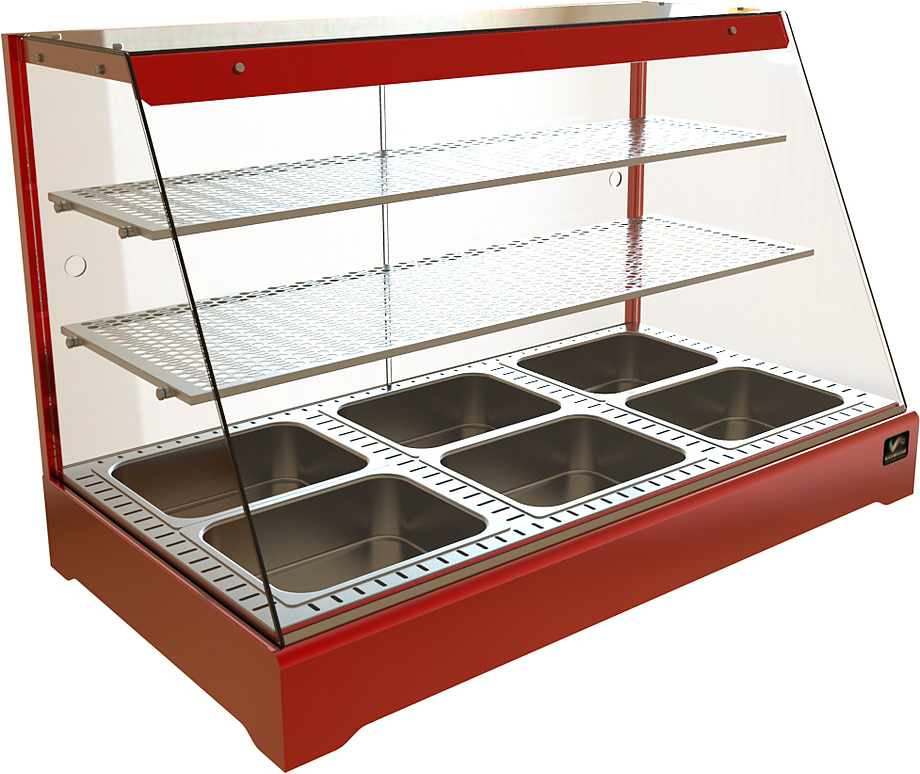 Тепловая витрина Кобор CR2-117H серии Standart предназначена для демонстрации, подогрева и поддержания в теплом состоянии различных блюд на предприятиях общественного питания и торговли. Модель оснащена перфорированными полками 1120х350 и 1120х280 мм и подсветкой.