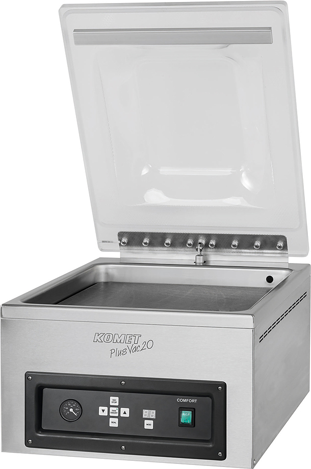 Вакуумный упаковщик KOMET PLUSVAC 20 используется предназначается для вакуумной упаковки мяса, сухофруктов, хлебобулочных изделий, гранулированных, порошкообразных и жидких продуктов на предприятиях общественного питания, торговли и пищевых производствах. Управление при помощи сенсорной панели, регулировка времени откачки воздуха и запайки. Упаковщик оснащен легкозаменяемой беспроводной запаечной планкой и заполняющими пластинами, регулирующими высоту. Материал корпуса - нержавеющая сталь, материал крышки - оргстекло.