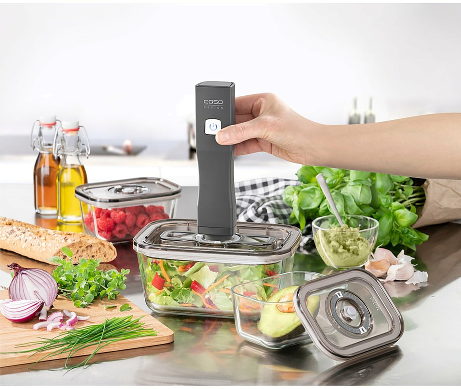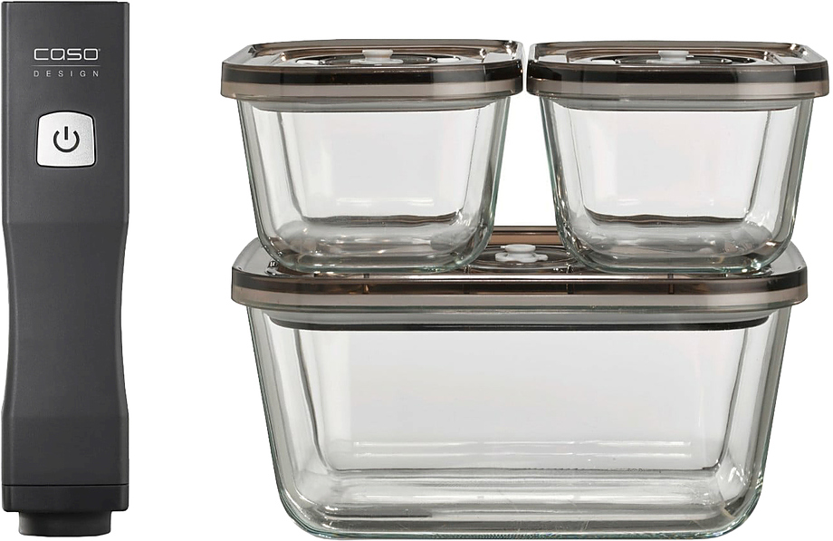 Набор CASO Vacu OneTouch Eco-Set используется на предприятиях пищевой промышленности, общественного питания и торговли для герметичной упаковки полуфабрикатов и готовых блюд в пакетах или контейнерах, что способствует продлению их срока хранения. Материал корпуса вакуумного упаковщика и крышек контейнера - пластик, материал контейнеров - стекло.