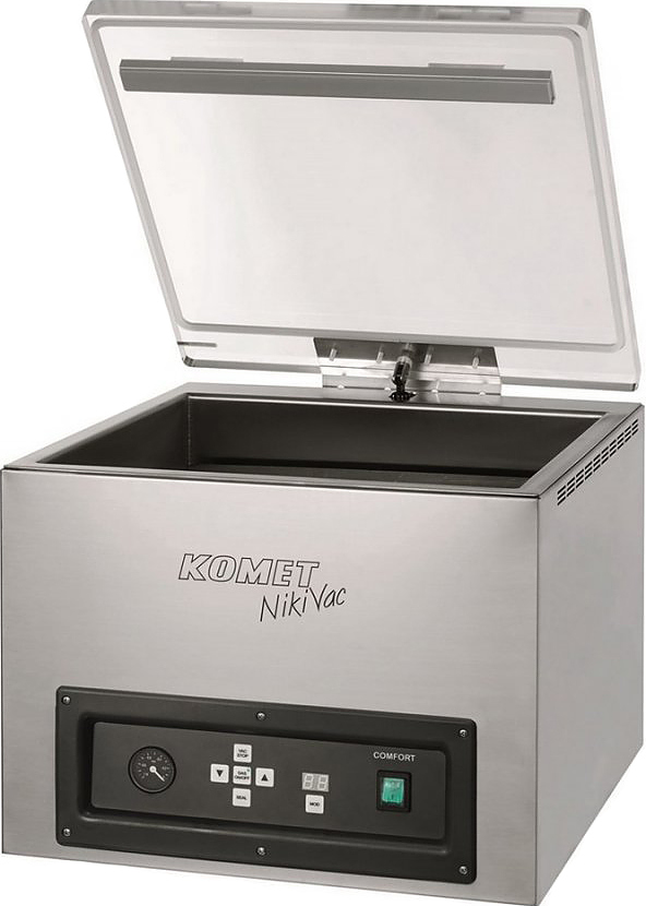 Вакуумный упаковщик KOMET NIKIVAC используется на предприятиях общественного питания и торговли для вакуумной упаковки мяса, приправ, сухофруктов, хлебобулочных изделий, медикаментов, гранулированных, порошкообразных и жидких продуктов. Модель оснащена легкозаменяемой беспроводной запаечной планкой и заполняющими пластинами для регулирования высоты. Корпус выполнен из нержавеющей стали, крышка - из оргстекла.