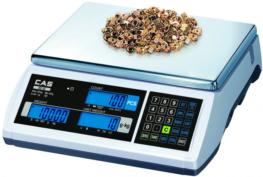 Счетные весы CAS EC-6 используются на предприятиях общественного питания и торговли. Модель оснащена жидкокристаллическим дисплеем с подсветкой, тензометрическим типом измерения, автоматической установкой нуля, выражением массы в количестве изделий (счетный режим) и индикацией разрядки батареи.